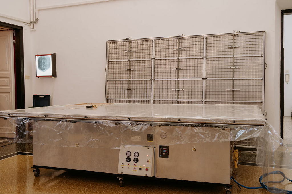 - Piano termico a bassa pressione con impianto di umidificazione 3x2 mt. (foto 44) ed idoneo telaio interinale espandibile per il tensionamento provvisorio dei dipinti
